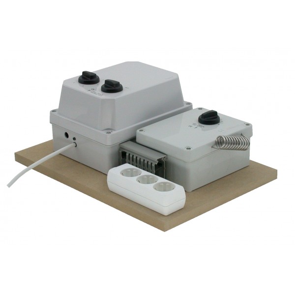 Der Dimmer wird in Kombination mit einem Thermostat auf einem Regal montiert, sodass die Dunstabzugshaube brummfrei arbeiten kann.